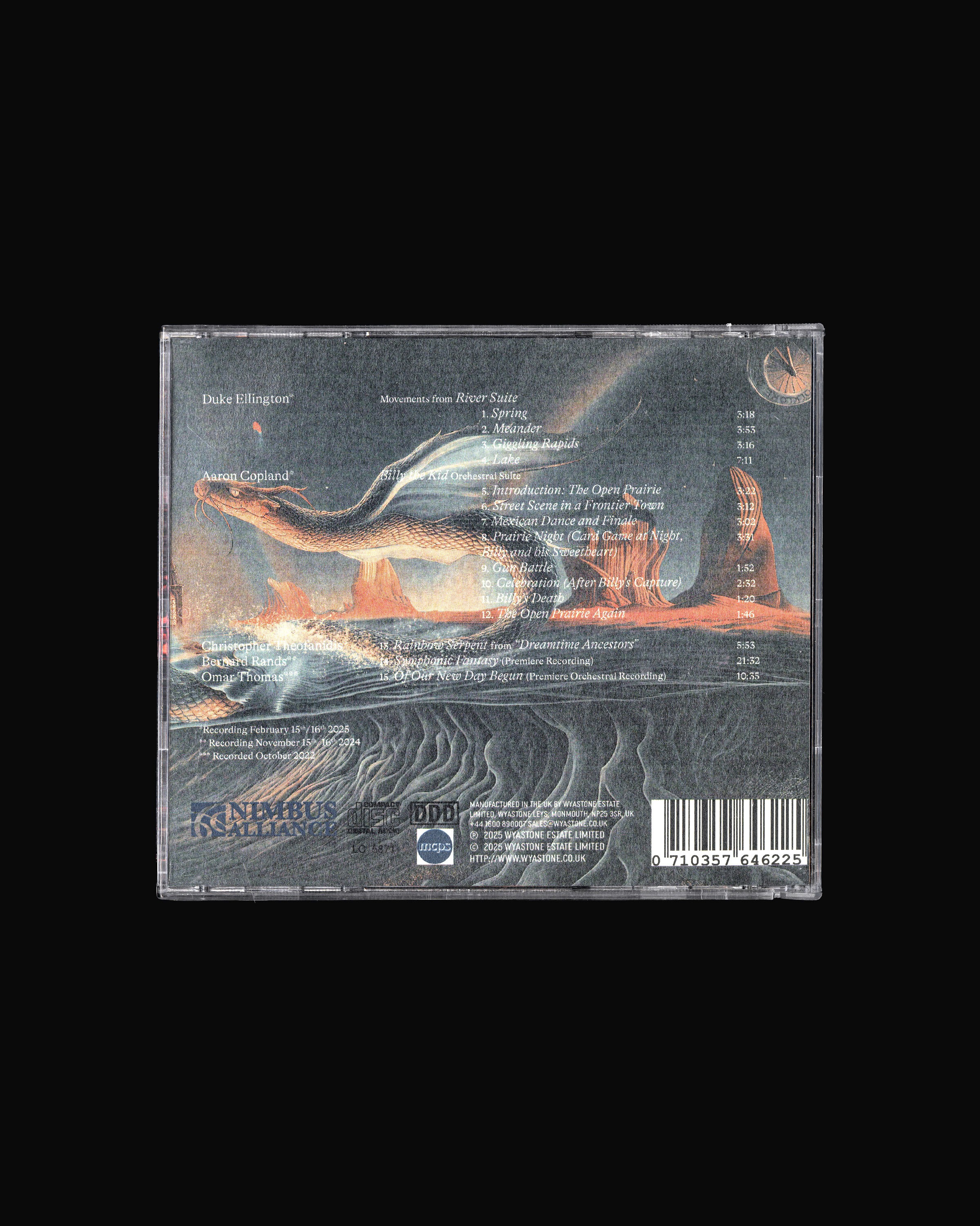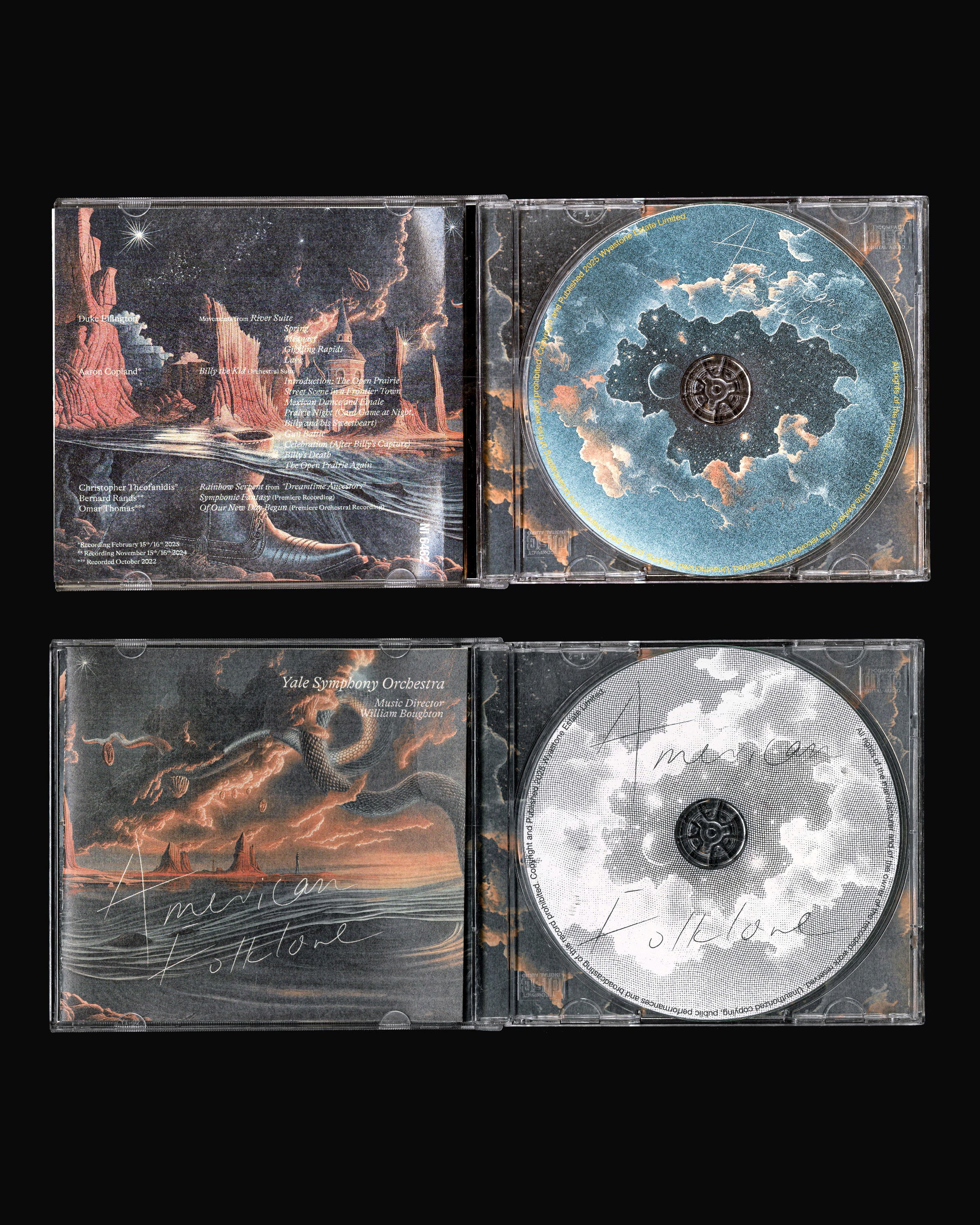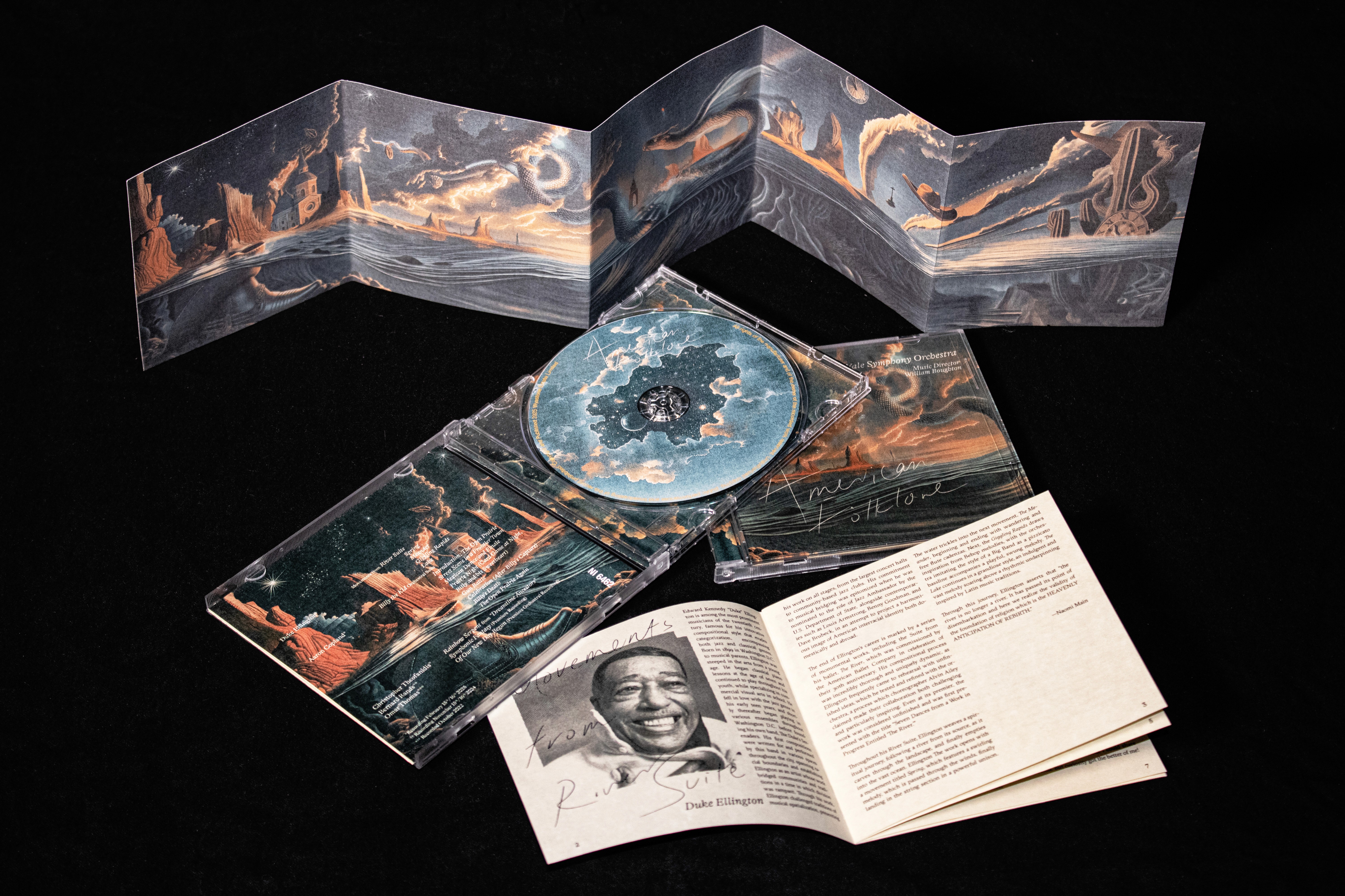 Commissioned by Nimbus Records and Yale Symphony Orchestra to design the album identity for a collection of American orchestral works spanning 1939 to 2021. We built the entire visual world around a single continuous landscape — a river flowing through time, where folklore, myth, and memory coexist in one painterly surrealist scroll. From commission to international release in one month. Now available on Spotify, Apple Music, and reviewed by BBC Music.