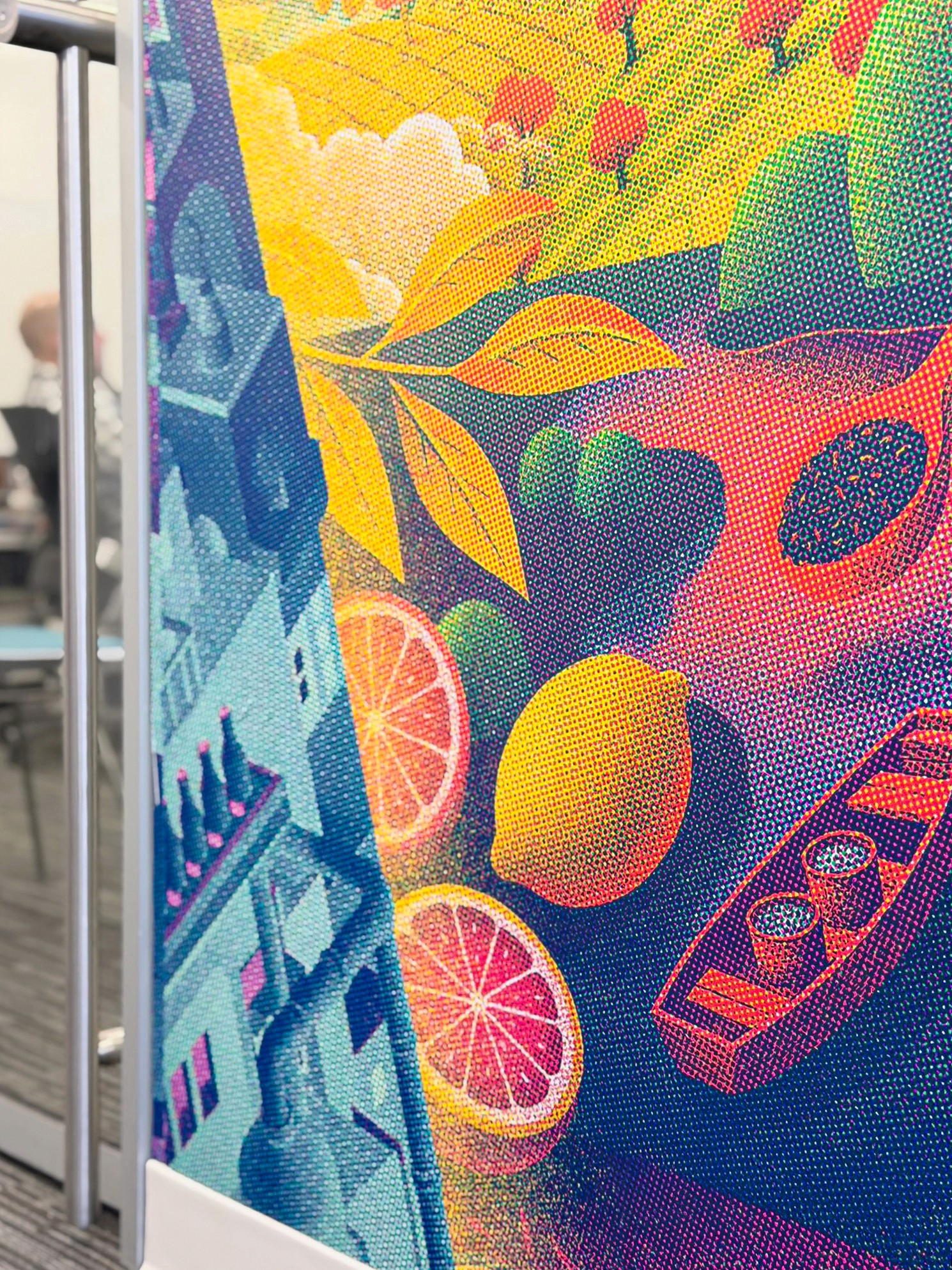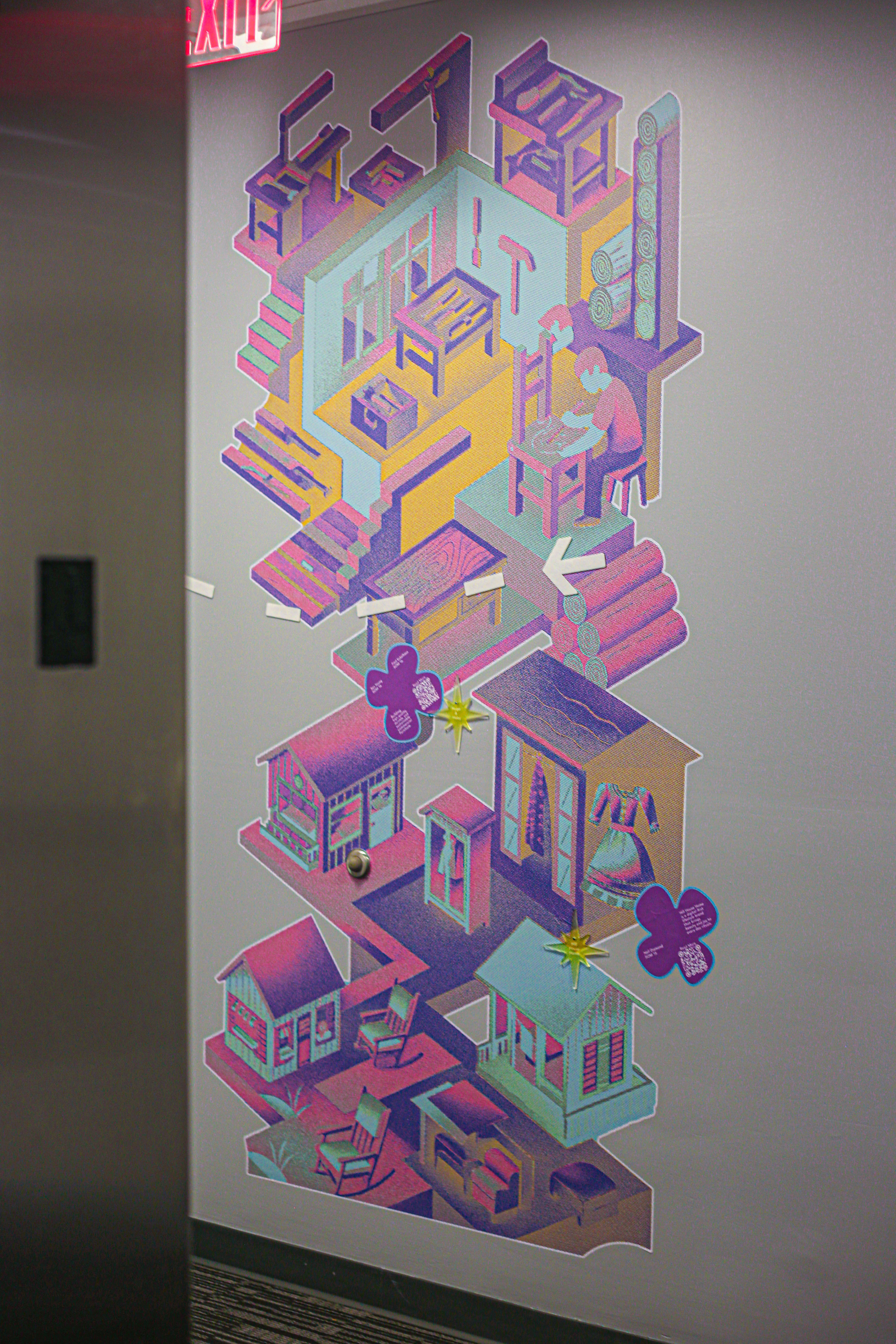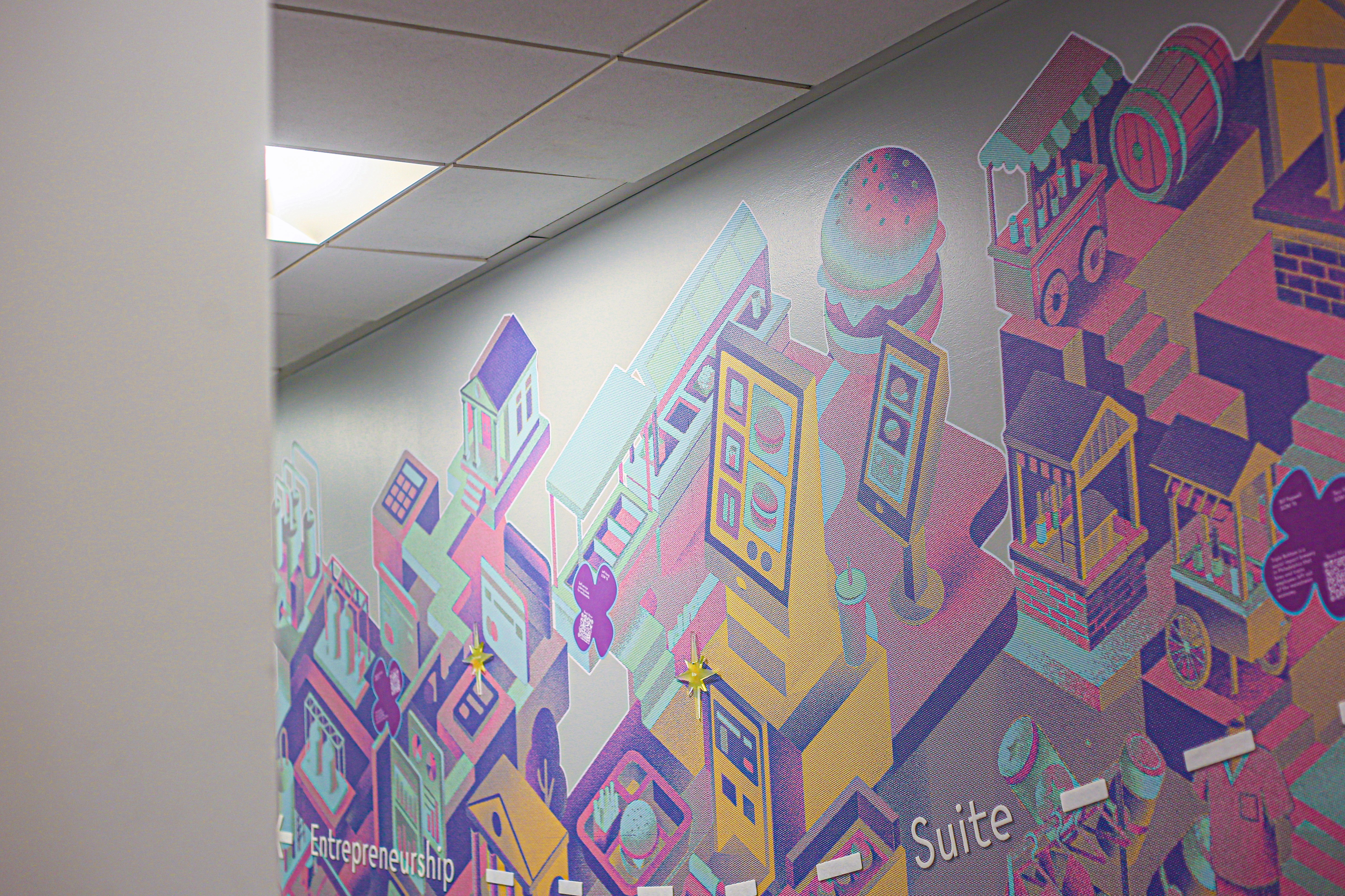 We curated ten ventures with the Suite director, arranged them by proximity — fashion near furniture, robotics near engineering — so they flow as a seamless walk through the garden. Three layers of information work together: vinyl mural as the base illustration, felt wayfinding arrows guiding visitors from the elevator to the Suite, and acrylic star-shaped cards with QR codes linking to long-form founder stories. Speech-bubble quotes from founders are printed on acrylic, as if the previous founders are speaking to incoming students from inside the Suite. We produced and installed everything ourselves.