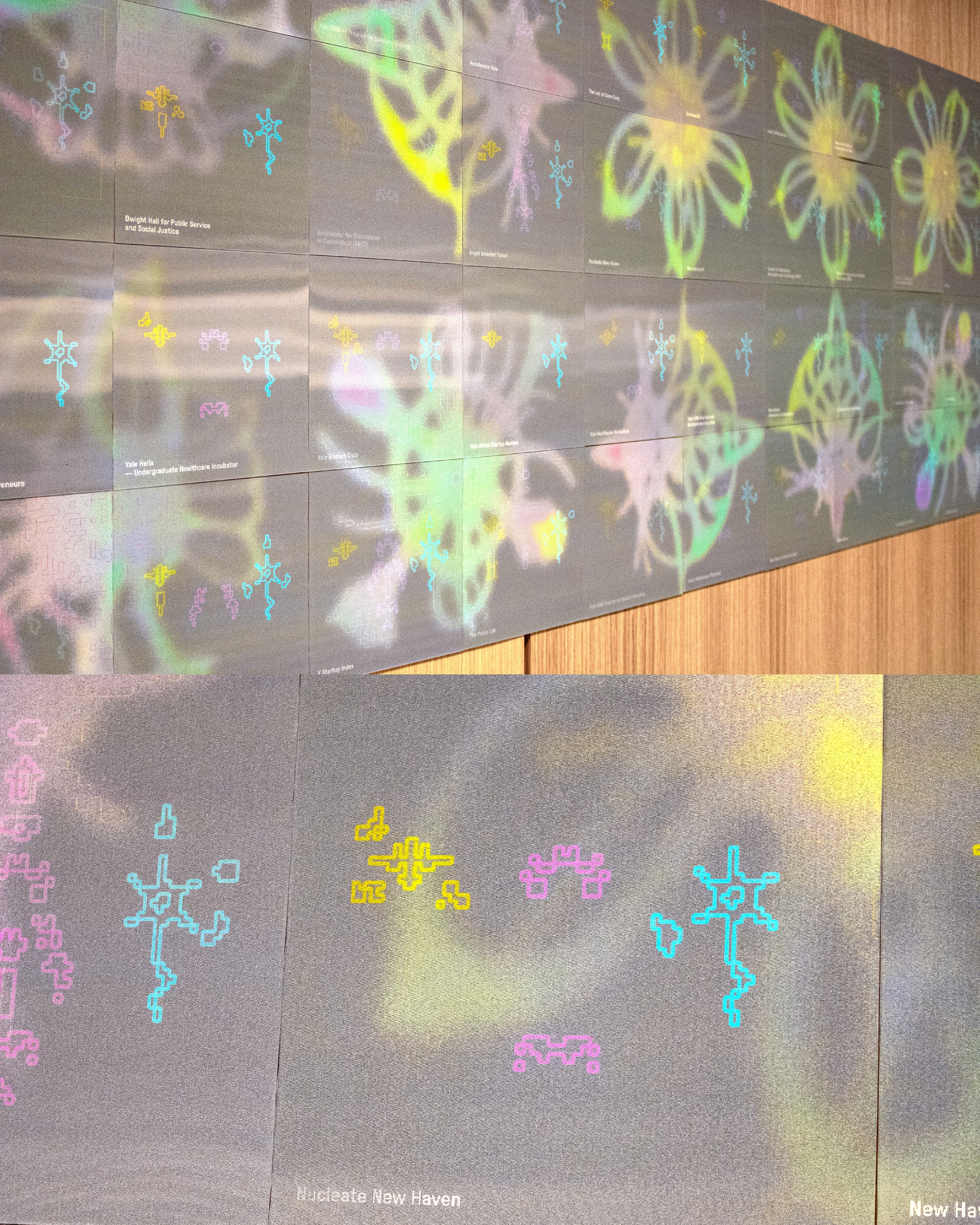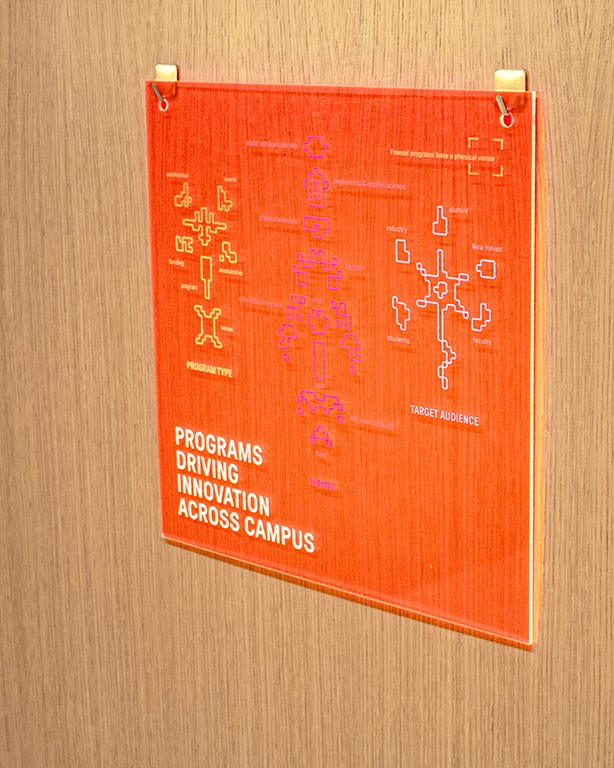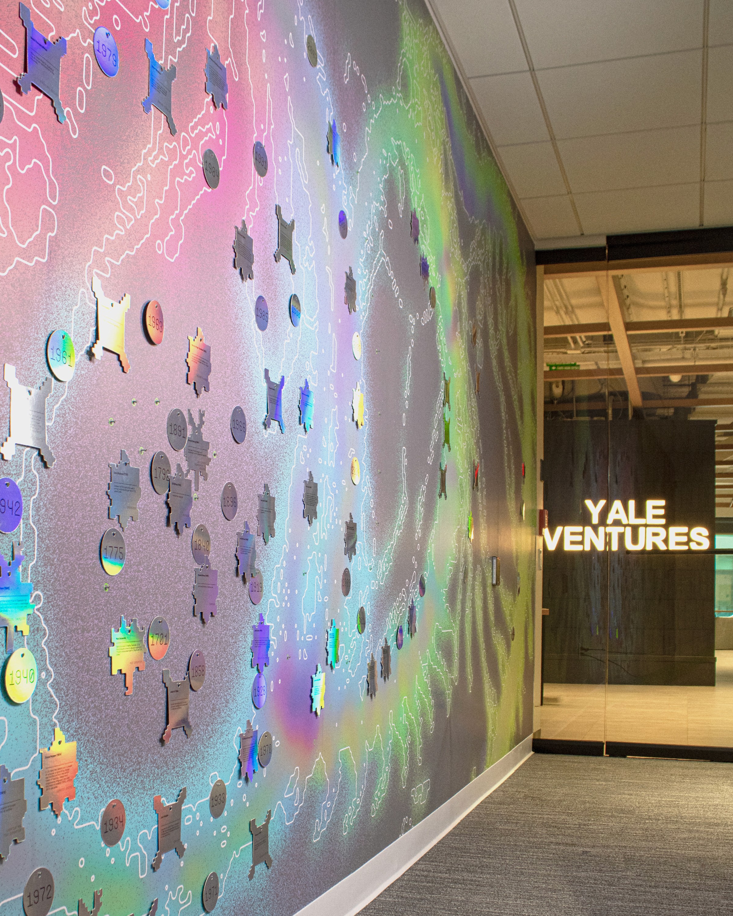 The system became the defining visual signature of Yale Ventures from opening day — the first thing visitors see and the thing they remember. Faculty began requesting prints of the research posters for their own labs, which was never part of the original scope. Yale Ventures adopted the visual language across their events and communications, turning a spatial design project into a living brand system. And because every element is modular, the system keeps expanding as new research, people, and stories enter the ecosystem.
