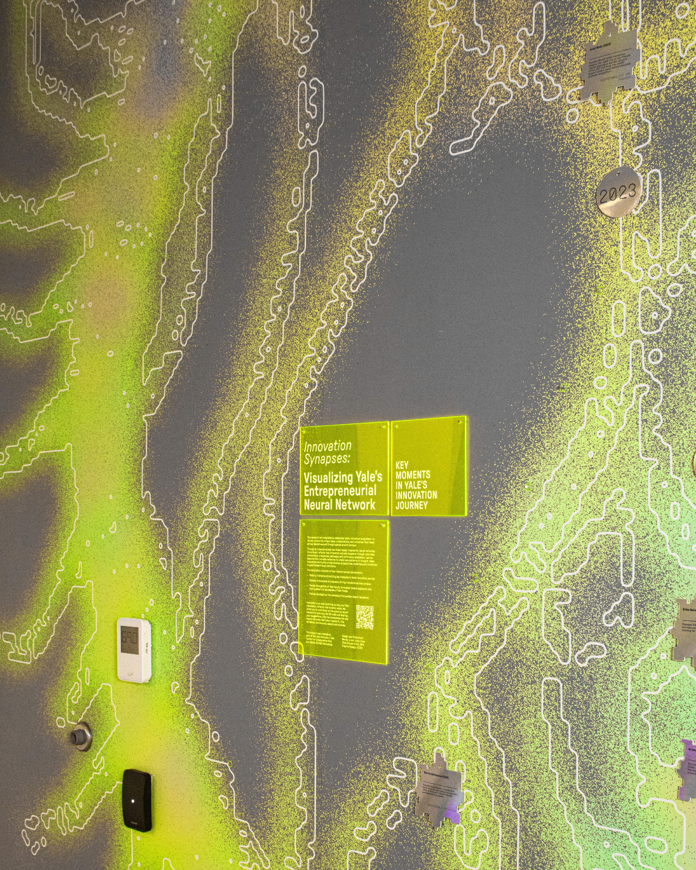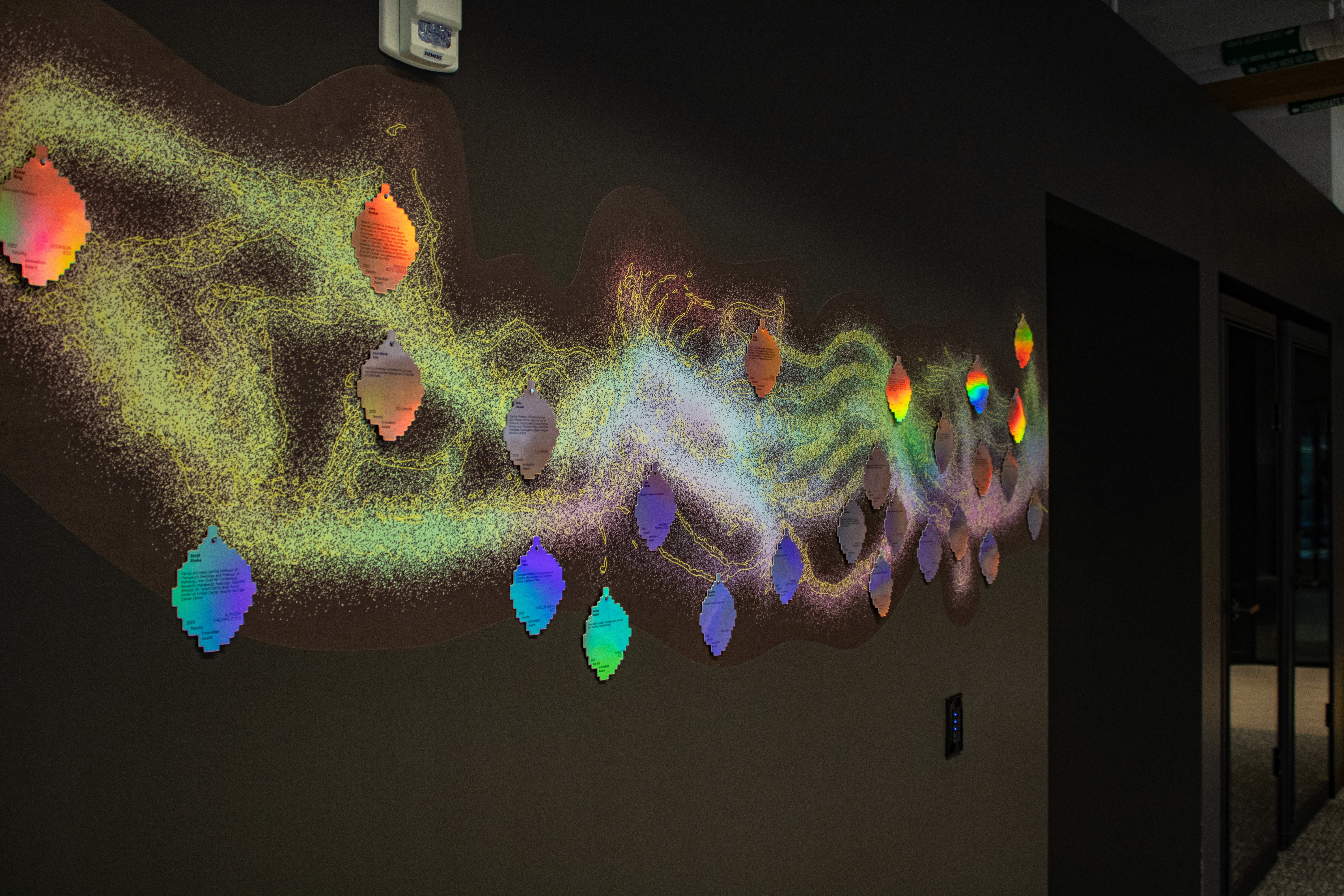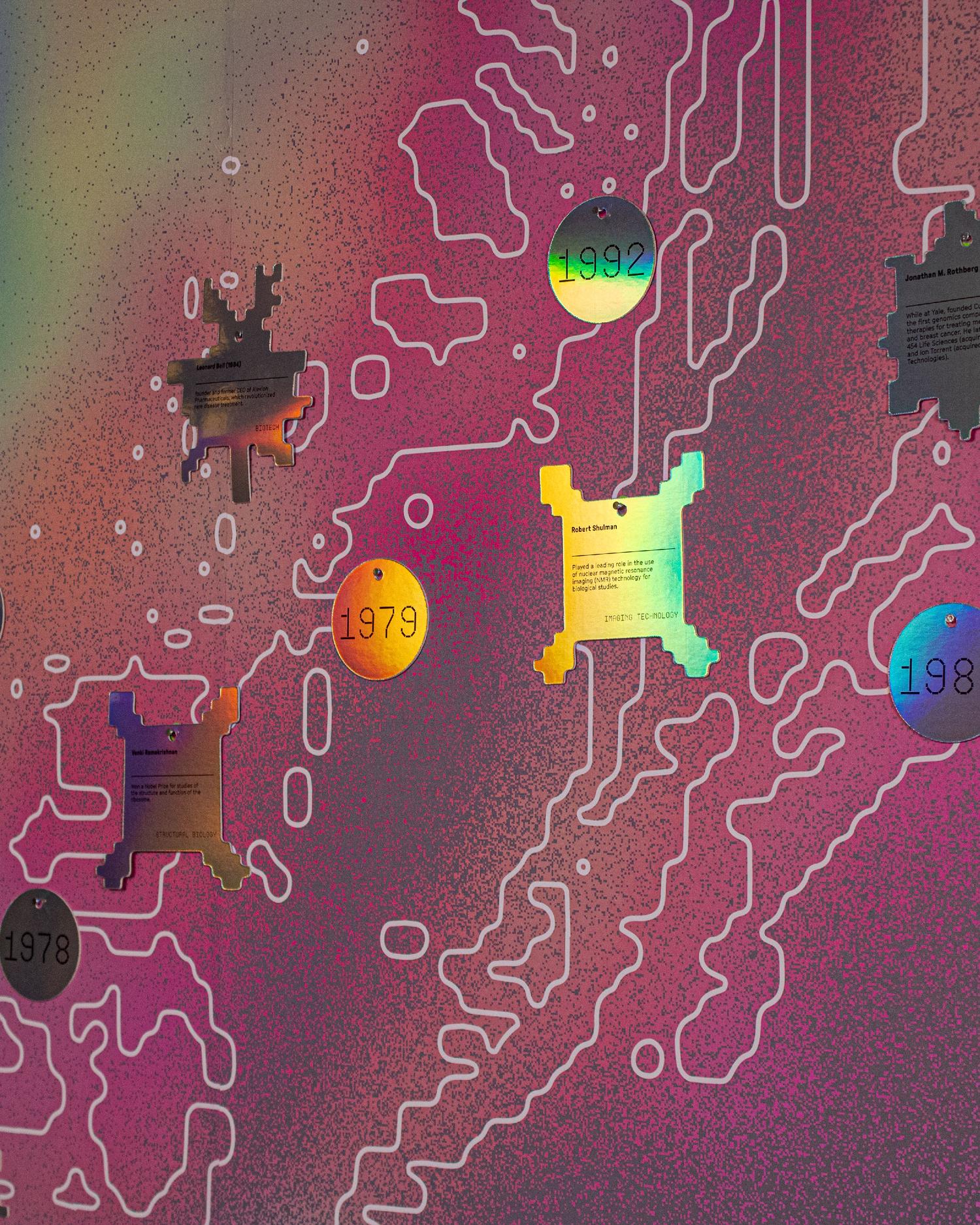 The system became the defining visual signature of Yale Ventures from opening day — the first thing visitors see and the thing they remember. Faculty began requesting prints of the research posters for their own labs, which was never part of the original scope. Yale Ventures adopted the visual language across their events and communications, turning a spatial design project into a living brand system. And because every element is modular, the system keeps expanding as new research, people, and stories enter the ecosystem.