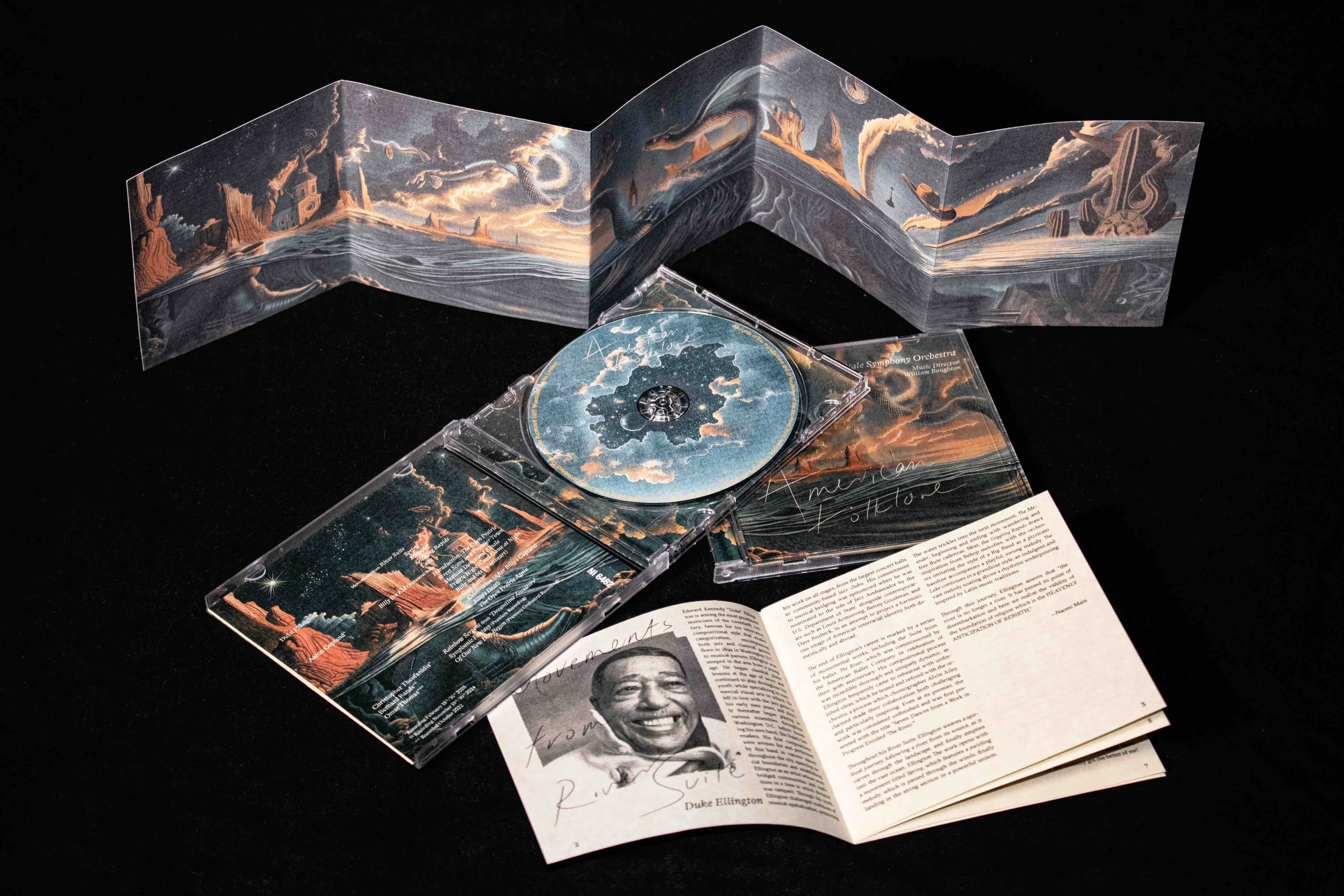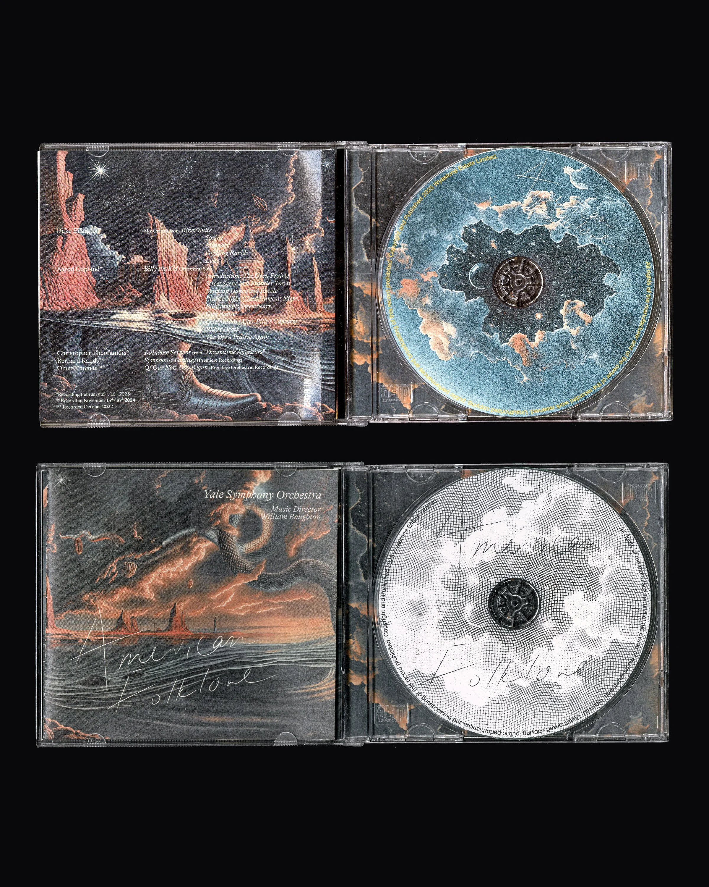 We were commissioned by Nimbus Records to design the Yale Symphony Orchestra’s new album. After immersing ourselves in the program—American Folklore, a musical narrative of transformation, we crafted a visual language that echoes its intricate, melodic spirit. Inspired by American modernists such as Georgia O’Keeffe and the dreamscapes of Dalí, we adopted a painterly, theatrical treatment, weaving motifs from each composition into the artwork.